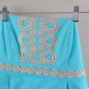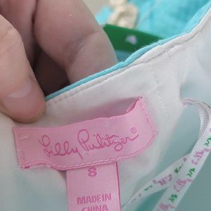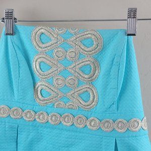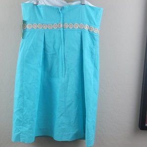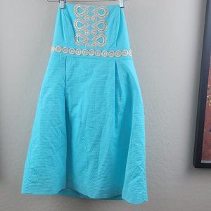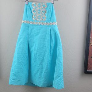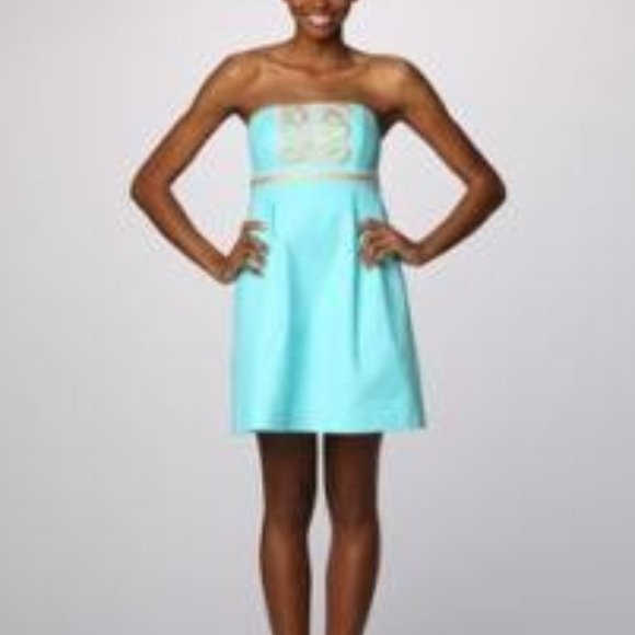 Lilly Pulitzer Betsey Wave Jacquard Dress Color: Shorely Blue Size: 8 Condition: Brand new w/ original tags Description from Lilly: It's still a Betsey-- one of our best fitting strapless dresses in our 2 most favorite colored jacquards this season...and did we mention the stunning touch of gold lace. It's the quintessential dress for Spring. Strapless empire waist dress with novelty lace detail. Hand wash cold. Zig Zag Jacquard.