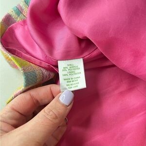 The Lilly Pulitzer Bibi Printed Multi Give Me Wings Boucle Strapless Dress in size 6 is a stylish and gorgeous option for various occasions such as weddings, parties, and cocktails. The square pattern and multi-color design give it a unique and eye-catching look. The strapless style and boucle fabric add a touch of elegance, while the short dress length makes it a trendy choice. Made from a blend of acrylic and polyester, this dress is both fashionable and comfortable for a night of fun and festivities.