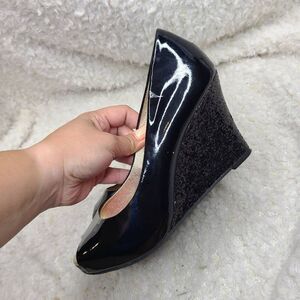 Lilly Pulitzer Black Patent Leather Resort Chic Glitter Wedge sz 7