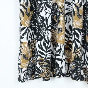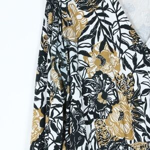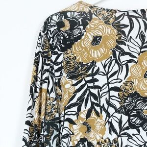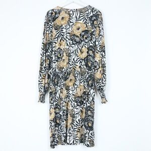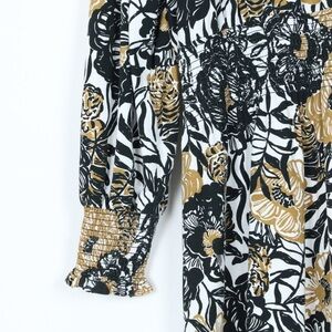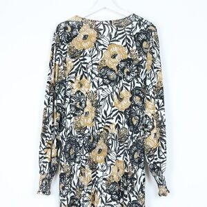 Chic long sleeve dress with bold floral design. Features striking black and gold hues. Ideal for stylish outings.