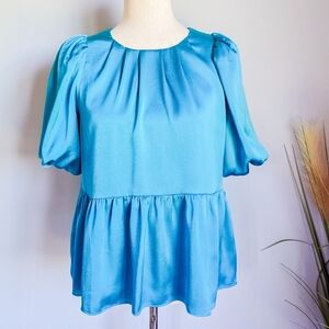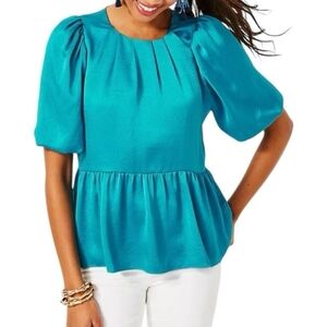 Lilly Pulitzer, Blakelynn Blue Rhapsody Puff Sleeve Peplum Hem Satin Blouse Top, Size Small 2