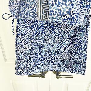 Appears as a mini dress overlay with romper shorts underneath. Side vents and ties. Concealed back zipper.