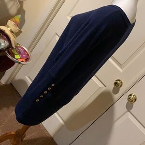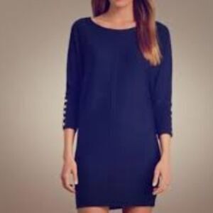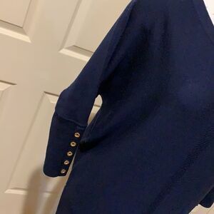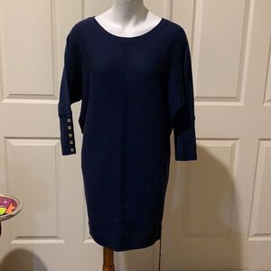 Beautiful pre owned contrition. 5 gold buttons on each sleeve. Breathable sweater fabric. Wool, dry clean only. Dress will need to be cleaned.