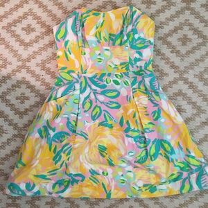 Floral a-line dress with pockets. Features boning in bodice for additional support.