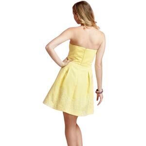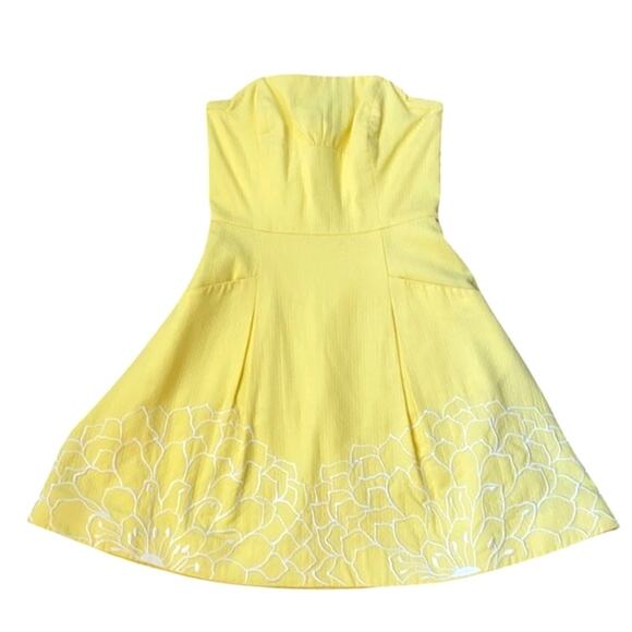 Lilly Pulitzer Blossom Dress! This masterpiece is a tribute to the season of sunshine, featuring a dazzling starfruit yellow color adorned with delicate dahling blooms embroidery. Whether it's a romantic wedding, a lively summer party, or a leisurely day out, this strapless dress is your ticket to turning heads and stealing the spotlight.