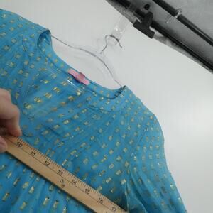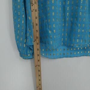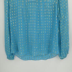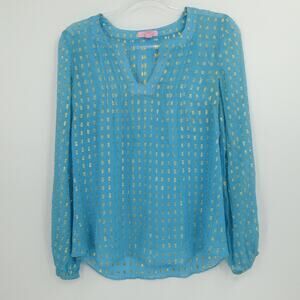Lilly Pulitzer Blouse Womens XS Blue Gold Metallic Sheer Tunic Silk Colby Crinkle Long Sleeve Top