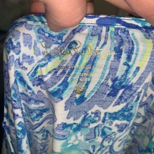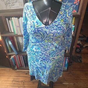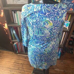 Lilly Pulitzer Blue Crush After Party, 3/4 sleeve, knit, comfortable, v-neck, Erin mini dress. Colorful and eye catching. Pairs well with your favorite flats and a jacket. Great for traveling and vacations. Approximately 17 inches from armpit to armpit, 17.5 inches across the waist, and 32 inches long. Hardly worn. From a pet and smoke free house.