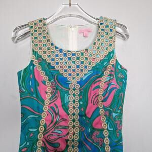 Lilly Pulitzer Blue Macfarlane Shift Dress Gold Embroidered Scoop Neck 00