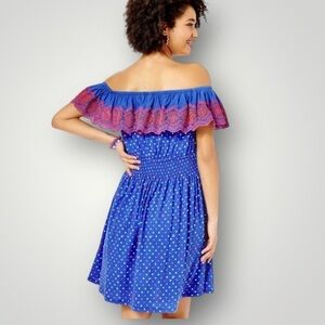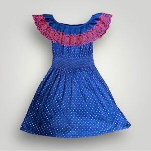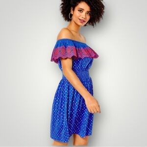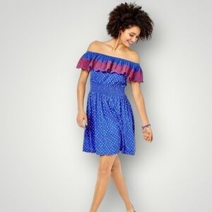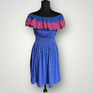 Lilly Pulitzer Blue Pink Polka Off Shoulder Dress | Smocked Ruffle Mini | Small