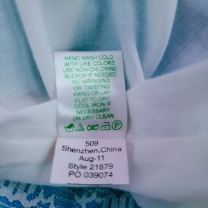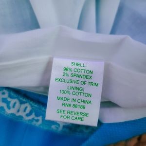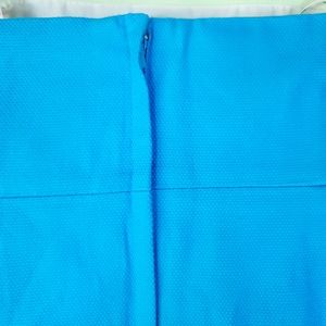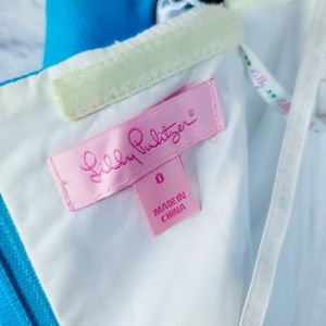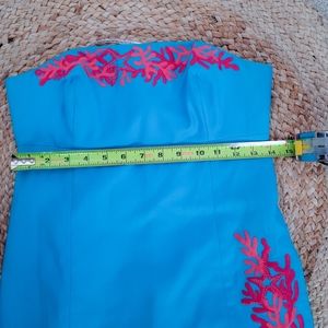 Lilly Pulitzer strapless summer dress. Vibrant blue & coral color with coral starfish stitching design on bust and at bottom corner. The bust has corset boning to help it stay shaped and up when wearing. Hidden back zipper, fully lined.