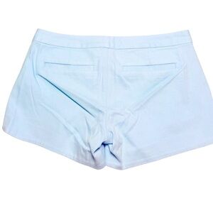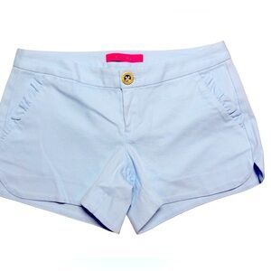 Lilly Pulitzer women’s shorts in a light blue textured cotton blend, size 00. Features a flattering tailored fit, front slant pockets, back welt pockets, and a signature gold-tone button at the waist. Made from a soft yet structured fabric with a touch of stretch for comfort.