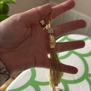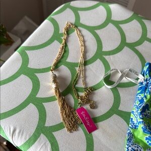 NWT Lilly Pulitzer gold tassel necklace. Comes with a vibrant blue and green drawstring bag by Lilly Pulitzer. Perfect for accessorie for dressing up your outfit!