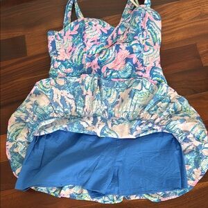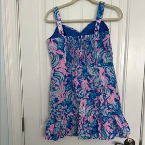 Lilly Pulitzer Rocko cotton romper with a vibrant blue and pink floral design. Perfect for any occasion. Rear zipper with elastic