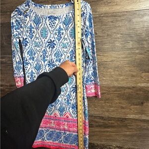 This casual resort wear dress by Lilly Pulitzer features a vibrant blue and pink geometric and floral print. Designed with a crew neck and 3/4 sleeves, it offers a comfortable and stylish sheath silhouette. The soft, stretchy fabric ensures a flattering fit, making it perfect for relaxed outings.