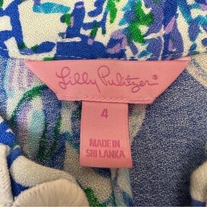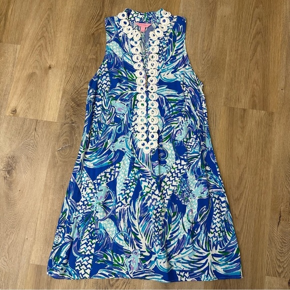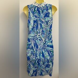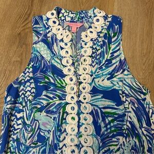 Excellent condition blue and white preppy mini dress from Lilly Pulitzer with white embroidery and gold hardware.