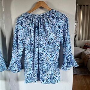 Lilly Pulitzer Blue and White Patterned Blouse. Willa Flounce sleeve