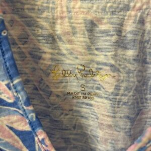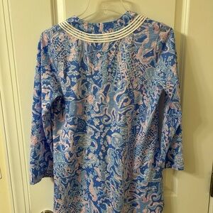 This Lilly Pulitzer tunic features a relaxed fit with a notched collar, offering a stylish and comfortable look. The blue and white pattern adds a fresh, coastal vibe, perfect for resort wear. Its tunic length and flowing design make it a versatile addition to any wardrobe.