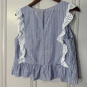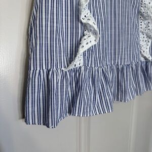 Chic blue and white striped blouse. Features ruffled sleeves with lace detail. Perfect for casual outings.