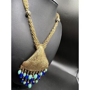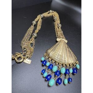 Lilly Pulitzer Bombshell long necklace with a large shell dripping with blue and green beads.