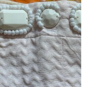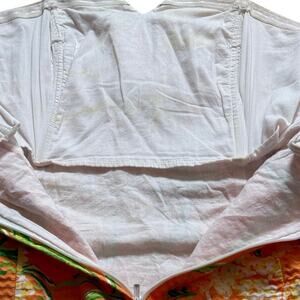 Lilly Pulitzer Bowen Strapless Mini Dress in “Nectar Orange Lace by the Docks” print. Size 0. White beaded jacquard bodice (a few beads missing, see photos), floral cotton skirt, built-in corset, silicone grip lining, and side boning. Back zip. Fully lined.