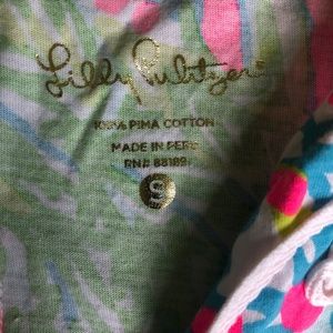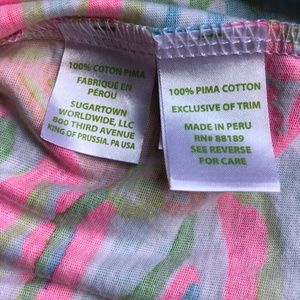 Lilly Pulitzer "Brewster" tee-shirt dress. Size S. This fabulous lightweight dress has a v-neck with flat ornamental braid detail. It has a cap/short sleeve. Vibrant colors of pink, blue and green. 100% cotton. In very good condition, although on very very close inspection some of the braid has a slight pink tinge to it. From smoke/pet-free home. Please feel free to ask if you have any questions.