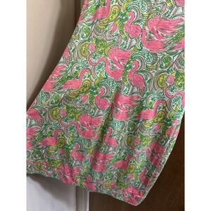 The Lilly Pulitzer Britton Hot Wings Pink Green T-shirt Flamingo Dress in size S is a stylish and vibrant addition to any woman's wardrobe. Made from 100% Pima cotton, this short sleeve dress features a fun animal print pattern with flamingos, perfect for beach or party occasions. The scoop neck and pullover closure make it easy to wear, while the colorful accents add a touch of flair. Machine washable and lightweight, this dress is ideal for summer, fall, or spring, showcasing a mix of tropical and preppy styles in a unique design by Lilly Pulitzer.