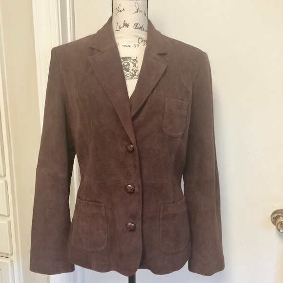 Elegant brown blazer with button closure. Features front pockets and classic lapel.
