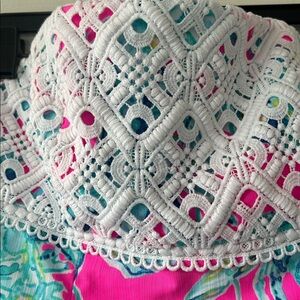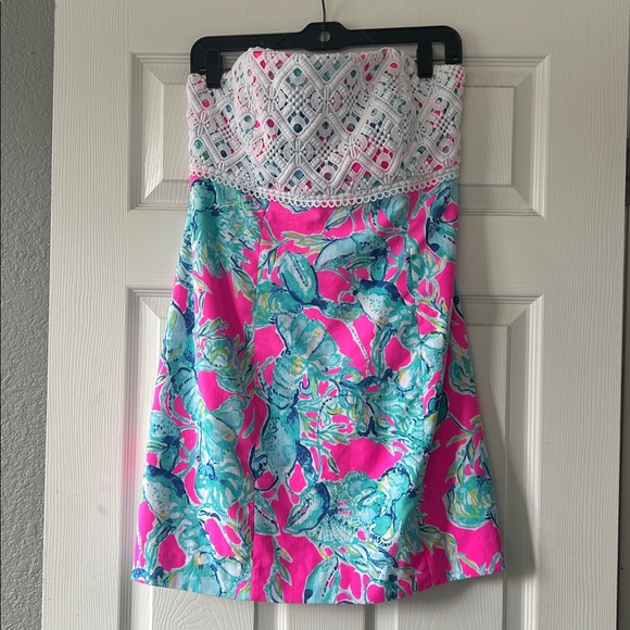 Lilly Pulitzer Brynn strapless lace dress Raz Berry Lobsters in Love, size 12. Beautiful hot pink with blues, green print with white crochet lace overlay on bust. Fully lined, zips up the back. Supportive internal boning in bust to stay in place. Does not have the removable straps. Excellent like new condition!
