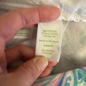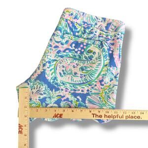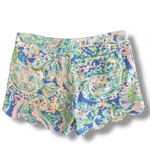 Vibrant and iconic Lilly Pulitzer Buttercup scallop hem shorts in a tropical pastel paisley print. Size 8, soft cotton-blend fabric (60% cotton / 21% polyester / 19% rayon). Front and back pockets, gold button closure, mid-rise fit. Excellent condition — no stains or flaws.