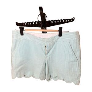 Classic and playful, these Lilly Pulitzer Buttercup shorts feature a soft seersucker stripe in mint green and white, finished with the brand’s signature scalloped hem. A timeless summer piece for casual outings or vacation wear.
