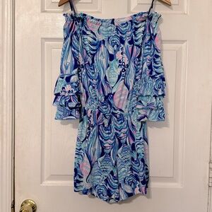 Lilly Pulitzer Calla Off-Shoulder Romper Pink Blue Tropical Print