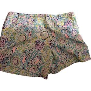 Lilly Pulitzer Callahan Knit Shorts, Blue Ibiza Open Water Print, Size 6. Low-rise, slim fit, washed knit shorts with front fly, slant front pockets and back welt pockets. Fabricated with Resort Ponte (67% rayon, 28% nylon, 5% elastane). Excellent condition. Retails for $68.