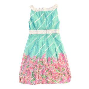 The excellent used condition Lilly Pulitzer Candice Keyhole Mini Dress in size 00 is a vibrant and stylish option for women looking for a colorful and eye-catching piece. This dress features a fun striped and butterfly pattern with embroidered accents around the neckline, making it perfect for a beach or summer-themed event. The sleeveless design and zip closure add a touch of convenience, while the short dress length gives it a trendy and flattering silhouette.