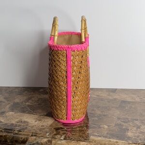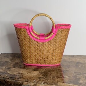Stylish woven tote bag featuring vibrant pink accents and bamboo handles. Perfect for adding a pop of color to any outfit.