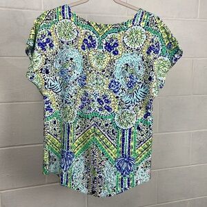 #lilly pulitzer, tunic top, women's top, casual top, rayon, colorful, alligator, floral, flowers, xsmall, summer, spring, fall, beach life, cap sleeve, green, blue, yellow, aqua, boat neck, tropical, hawaiian, vacation, resort wear, cruise, travel, bright, modern, fun, animal print