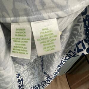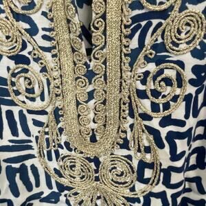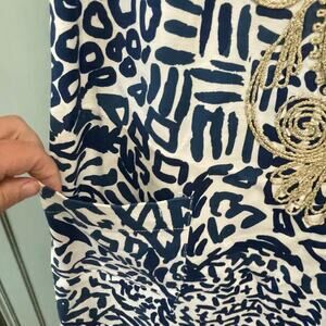 Excellent condition womens size 0 Lilly Pulitzer Carlotta dress in a blue and white pattern print Indigo Home Slice-has gold accents at the chest and neck, exposed gold zipper in the back-comfortable rayon and spandex blend