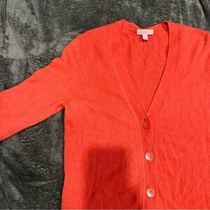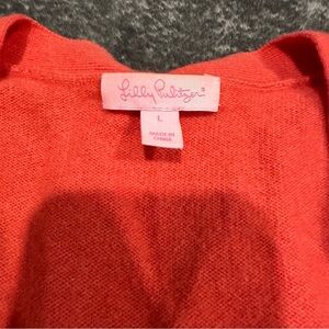 Pre-owned condition. Lilly Pulitzer Cashmere Cardigan in a size Large . 100% cashmere. Please note imperfections in photos. Listed as pink, but is a coral color