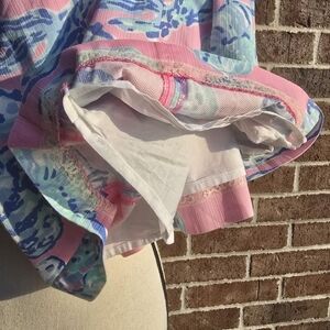 This is a gorgeous, 100% cotton shift dress from Lilly Pulitzer It is called the Cathy Shift and the pattern is the Pink Pout Barefoot Princess. This dress is lined. Zippered back closure with small circle embroidered trim.