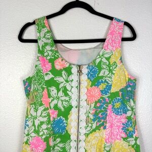 Women's Lilly Pulitzer Cathy shift Hibiscus Stroll green printed mini dress, size 8. Boat neckline, sleeveless, back zipper closure. 100% cotton.
