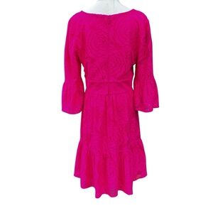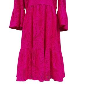 The Lilly Pulitzer Cecelia Dress in Pink is a vibrant, feminine piece featuring a flattering fit-and-flare silhouette. Crafted from a lightweight, breathable fabric, it showcases intricate crochet lace detailing and a V-neckline. The dress is complemented by bell sleeves, adding a touch of bohemian flair. Its knee-length design makes it suitable for various occasions, from casual outings to semi-formal events.