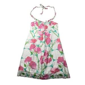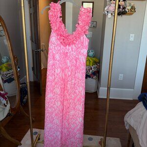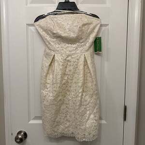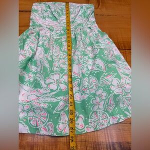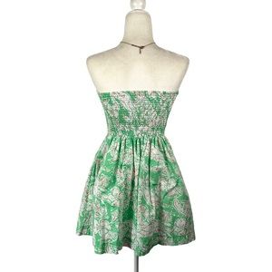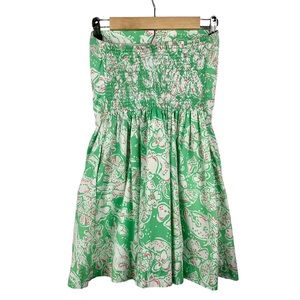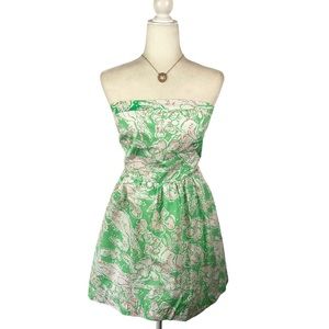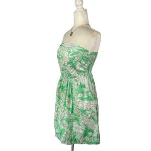 Chic strapless dress by Lilly Pulitzer. Features a vibrant green and white pattern. Perfect for summer occasions. Pockets, elastic back and boning on top. Good used condition.