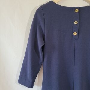 Elevate your wardrobe with this classic Lilly Pulitzer Charlene shift dress in a rich navy blue. Designed in a textured knit fabric, this minimalist yet sophisticated piece features 3/4 sleeves, a faux waist pocket detail accented with a gold button etched with the Lilly Pulitzer logo, and a tailored silhouette that flatters effortlessly. The cotton-poly-spandex blend offers comfort, structure, and a touch of stretch.