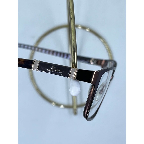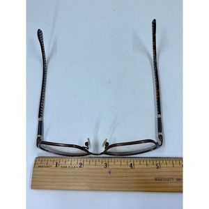 Bronze colored metallic frames with brown/white striped acrylic interior of the arms.