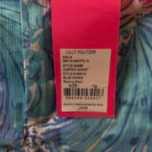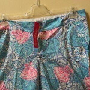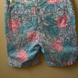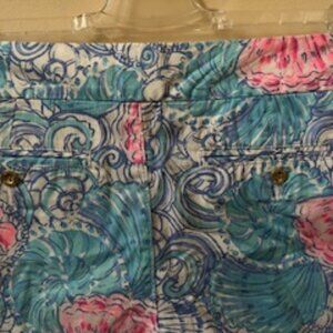 Lilly Pulitzer flat-front Chipper Short. Pattern: Raising Shell. Zip fly. Metal button closure. 2 slash pockets on front. 2 back pockets with metal button closures. No belt loops. 100% cotton. Unlined.