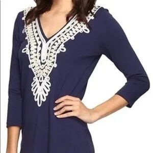 Lilly Pulitzer Clarkson Navy gold trim white scroll 3/4 sleeve dress Embroidered