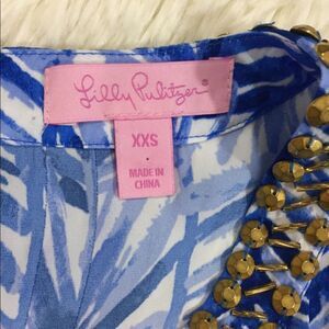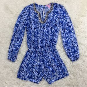 Super cute pre-owned Lilly Pulitzer Colby Romper in color Lapis Blue Costa Verde. Elastic waist. Romper is sheer so it can be worn as a swim coverup. Long sleeve. Gold beaded detail around neckline. Style 25281. No stains, holes or pulls in fabric. Please ask all questions before purchasing.