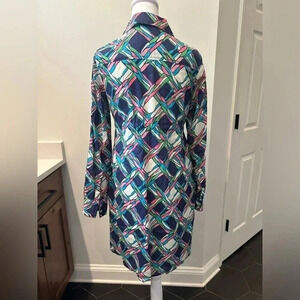 Geometric Pattern shirt dress. Button up with ruffle detail on top. Waist strap to tighten or loosen. Button long sleeves. Excellent preowned condition, smoke free home.