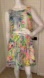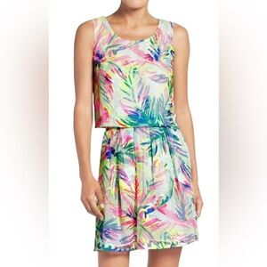Vibrant dress with a tropical leaf pattern. Features a mix of pink, green, and blue hues.