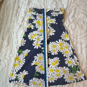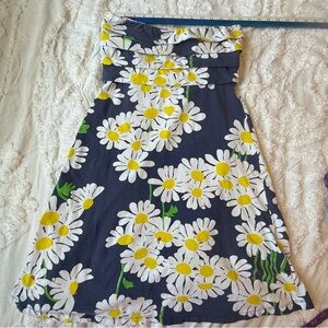 Chic strapless dress with bold floral design. Features navy and yellow flowers. Waist layered design. Shows some wear but still has life! A9