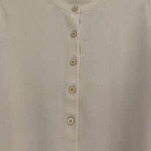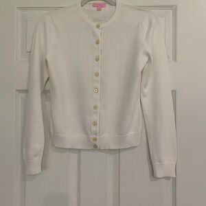 Lilly Pulitzer cardigan, white sweater, button front sweater, resort wear, classic preppy style, women’s size small, coastal chic, spring summer layering, designer cardigan, beach vacation sweater, wardrobe essential